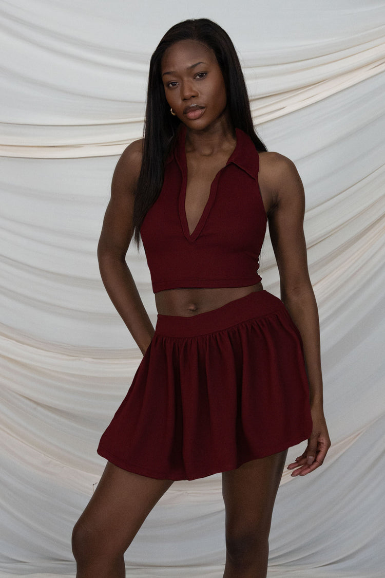 Şıklığı ve rahatlığı bir araya getiren Bordo Halter Yaka Crop Top, dolabının olmazsa olmaz parçası olacak. Vücuda oturan formu ve derin V yaka detayı ile feminen bir duruş sunarken, retro ilhamlı krem rengi biyeleri ile dikkat çeker.